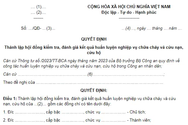 Hiện nay Mẫu quyết định thành lập hội đồng kiểm tra, đánh giá kết quả huấn luyện nghiệp vụ chữa cháy và cứu nạn, cứu hộ được quy định tại Mẫu số 04 ban hành kèm theo Thông tư 02/2023/TT-BCA, cụ thể:
