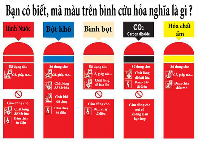 – Về tác dụng đối với người: Bình CO2 không được phun trực tiếp vào cơ thể người bởi dễ bị bỏng lạnh do khí CO2 được nén ở nhiệt độ -79 độ C. Còn bình bột thì không.