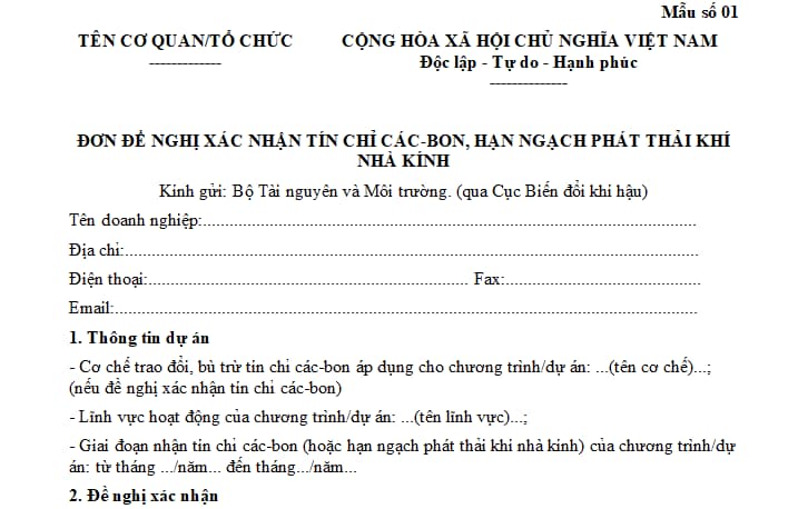 Tải Đơn đề nghị xác nhận tín chỉ các bon, hạn ngạch phát thải khí nhà kính: Tải về.