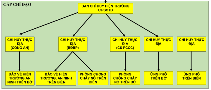 UBND/Trưởng BCH PCTT&TKCN thành phố thực hiện việc chỉ đạo thông qua Ban chỉ huy hiện trường, Ban chỉ huy hiện trường chỉ huy các lực lượng ứng phó thông qua các Chỉ huy thực địa, các Chỉ huy thực địa trực tiếp chỉ huy các lực lượng do mình phụ trách.