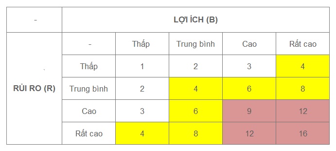 Đó là việc kết hợp giữa mức độ nghiêm trọng và khả năng xảy ra (nhân số điểm của mức độ nghiêm trọng và khả năng xảy ra) chúng ta sẽ có thang điểm từ 1 ~25.