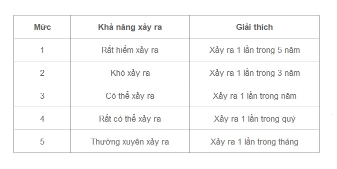 Để xác định khả năng xảy ra, chúng ta cũng phải dựa vào lịch sử hoạt động của doanh nghiệp của bạn để xem xét vấn đề đó bao lâu xảy ra một lần, từ đó chúng ta cũng phân chia ra các cấp độ khác nhau để dễ đánh giá (ví dụ tham khảo bên dưới). Nếu doanh nghiệp mới thành lập chưa có số liệu thì chúng ta có thể tham khảo ở các doanh nghiệp cùng lĩnh vực, cùng ngành hoặc cùng điều kiện môi trường hoạt động.