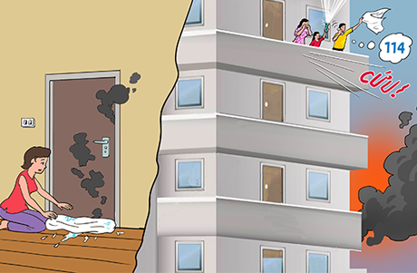 Nếu không thể thoát ra ngoài, dùng khăn, vải thấm nước, băng dính bịt khe cửa; di chuyển ra ban công, gọi to,…
