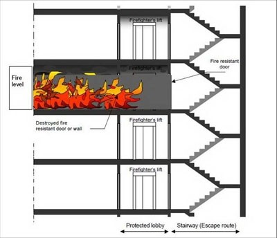 – Trong mỗi khoang cháy của các nhà có chiều cao >28m (trừ nhà nhóm F1.3) bố trí thang máy đáp ứng yêu cầu để vận chuyển lực lượng và phương tiện chữa cháy (theo quy định tại mục 5.14 QCVN 06:2010/BXD).