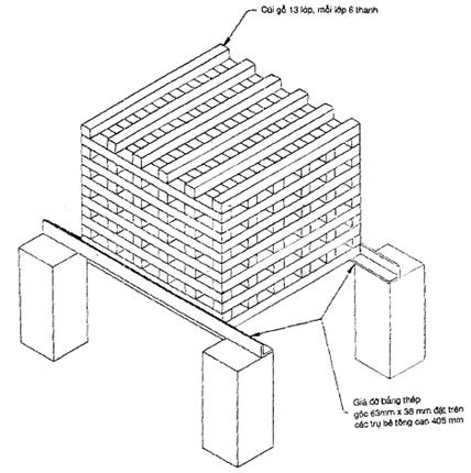 Mô hình thử nghiệm gồm những thanh gỗ xếp kiểu cũi đặt trên hai thanh sắt góc 63mm x 38mm hoặc giá đỡ thích hợp, kê trên bốn trụ bê tông cao 405mm so với mặt sàn. Những thanh gỗ xếp ở rìa cũi phải buộc hoặc đóng đinh vào nhau chochắc.