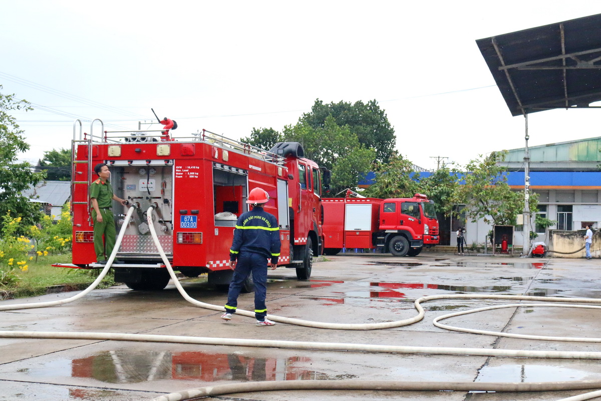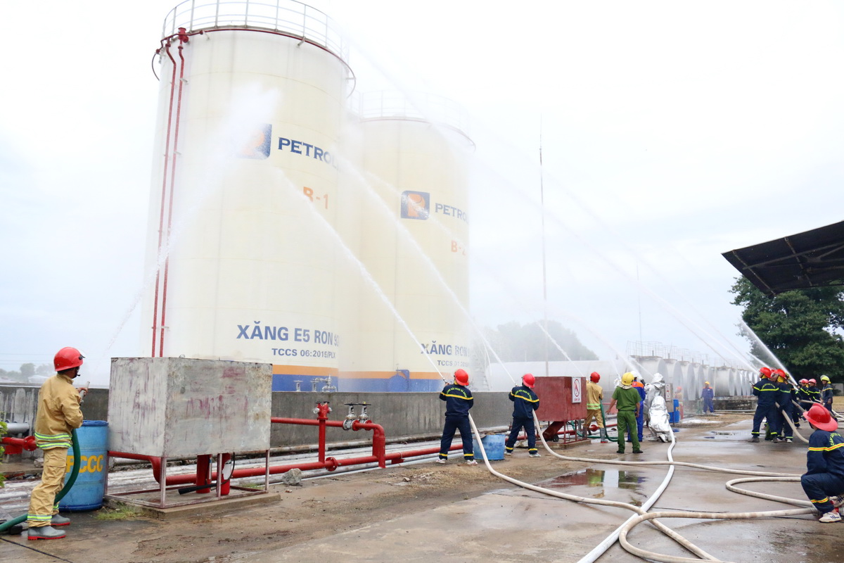 Tình huống giả định lúc 15h00 ngày 02.08.2019, xảy ra vụ cháy do quá trình xuất xăng, dầu bị rò rỉ đường ống tại bể trụ đứng B2 chứa xăng, xảy ra sự cố cháy, khả năng phát triển của đám cháy càng lớn, ngọn lửa nhanh chóng bao trùm khu vực bể chứa B2 và khả năng cháy lan sang khu vực bể trụ đứng B1. Dưới tác dụng của nhiệt độ và bức xạ nhiệt từ vùng cháy tỏa ra nhiều khói, khí độc, nhiệt độ tăng nhanh và cao dẫn đến cháy lan, cháy lớn gây khó khăn cho công tác cứu người, cứu tài sản và chữa cháy.