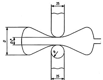 - Nén ép năm mẫu bình chữa cháy theo phương vuông góc với đường trục dọc của bình và tại điểm giữa bình bằng hai dụng cụ áp dày 25 mm, bán kính ở đỉnh dụng cụ 12,5 mm và có chiều rộng đủ để vượt ra ngoài các cạnh bên của bình chữa cháy (xem Hình 7). Nén ép bình trong khoảng thời gian từ 30 s đến 60 s. Trong trường hợp bình chữa cháy có một mối hàn dọc, đặt mối hàn ở vị trí tạo thành với các đường sinh chịu nén ép của bình một góc 90 o. Đối với các bình chữa cháy có các mối hàn ngang ở giữa, đặt dụng cụ nén ép tạo thành với mối hàn góc 45 o.