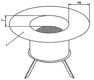 - Đặt một bề mặt phẳng bao hoàn toàn xung quanh khay đám cháy. Bề mặt phẳng phải có chiều rộng 750 mm và được bố trí mép đỉnh của khay đám cháy. Bề mặt phẳng phải được phủ một lớp bột natribicac bonat dày 2 mm. Đốt nóng dầu trong khay đám cháy bằng nguồn nhiệt của nó tới khi đạt được nhiệt độ 175 oC đến 195 oC. Cho mỗi bình chữa cháy đã được ổn định hóa phun hết và phun liên tục về phía tâm của khay đám cháy trong khoảng 5 min sau khi bình chữa cháy được ổn định hóa với vòi phun được giữ ở khoảng cách do nhà sản xuất bình chữa cháy qui định và được chỉ ra trên biển nhãn của bình chữa cháy, nhưng không lớn hơn 2 m. Đo khoảng cách từ cạnh trước của khay đám cháy đến vòi phun.